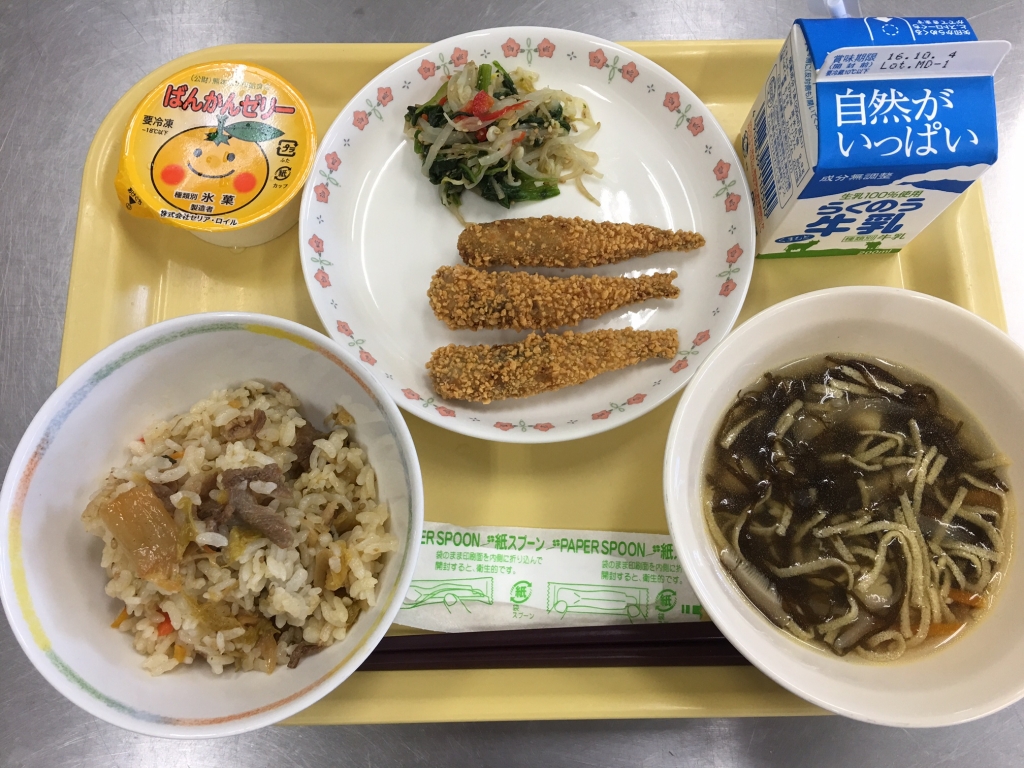 「豚キムチごはん もぞくスープ いわしのカリカリフライ もやしのナムル ばんかんゼリー」でした。