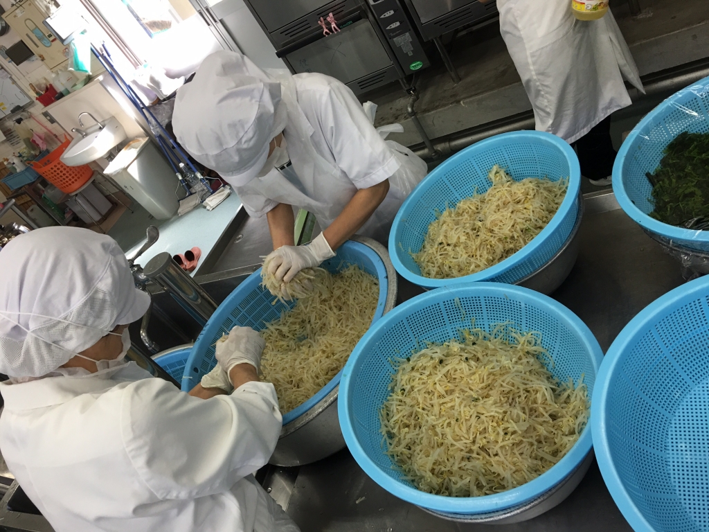 調理の様子を紹介します。↓ナムルのもやしをしぼっているところです♪残さず食べよう。
