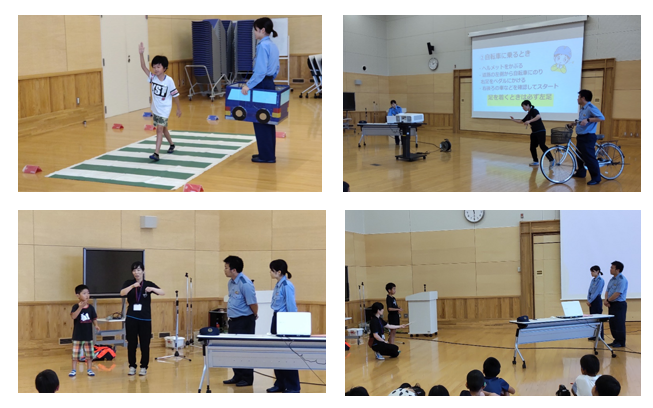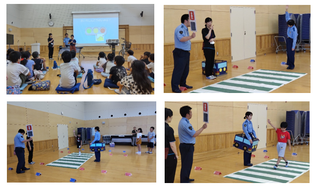 今回は東警察署からお二人の警察官が来られ、横断歩道の歩き方と自転車の乗り方の指導をしていただきました。