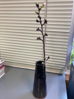 朝、校長室に入ると桜のつぼみをたくわえた一輪挿しが目に留まりました。