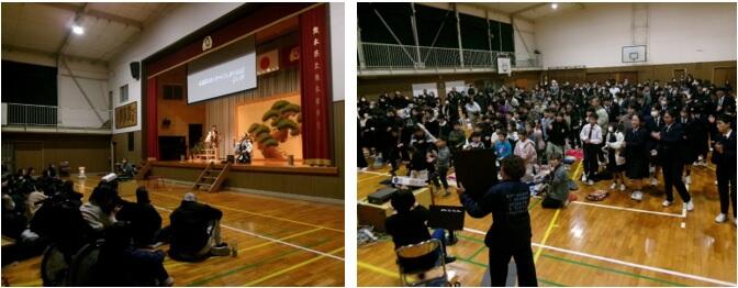 「盆山」「附子」について演者の方から丁寧な説明を頂き、盲学校、熊本はばたき高等支援学校、そして本校の児童生徒が楽しんで鑑賞することができました。また、「蝸牛」の共演に会場全体が盛り上がりました。