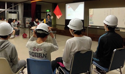緊急時の合図・地震などの災害が起きたときの避難経路などを確認しました。実際に起きたときのために、自室に備えてあるヘルメットを被り自分に合った長さに調節しました。