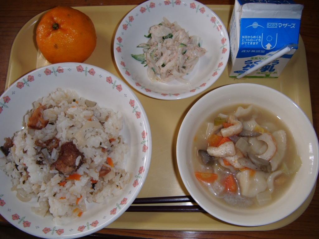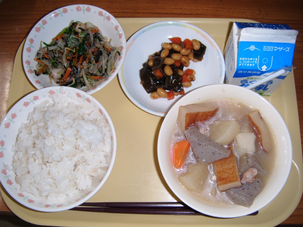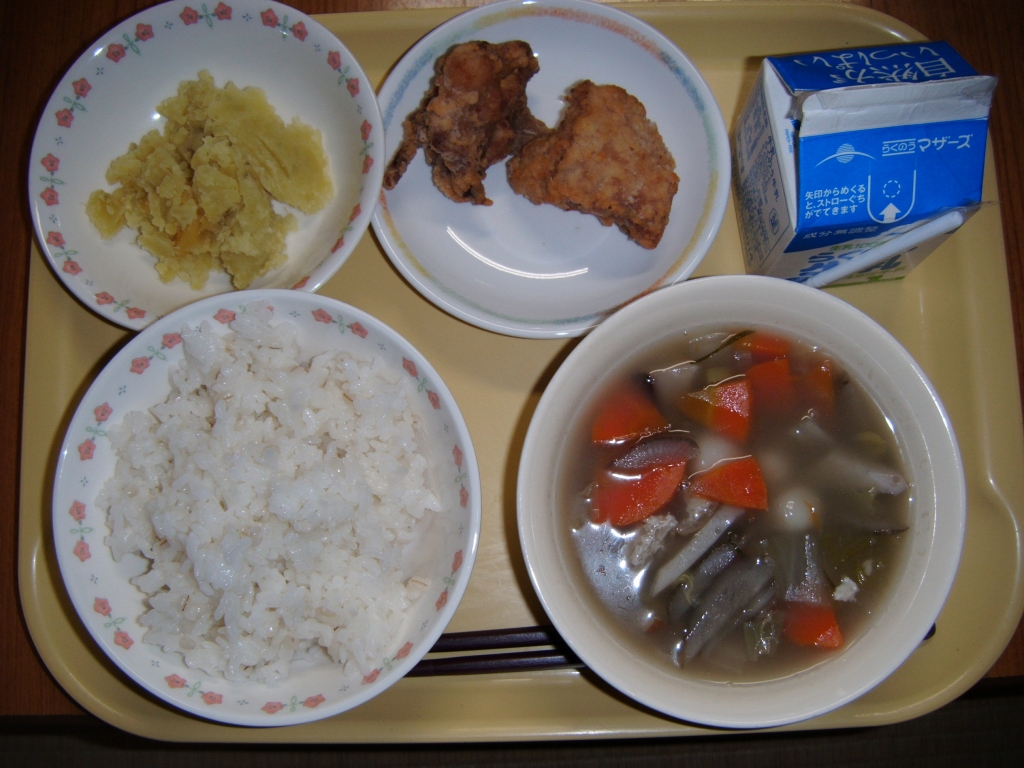 「牛乳、麦ごはん、からあげ、くりきんとん、具ぞうに」