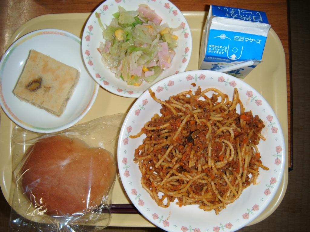 「牛乳、米粉パン、スパゲティミートソース、サラタマドレッシングサラダ、バナナケーキ」