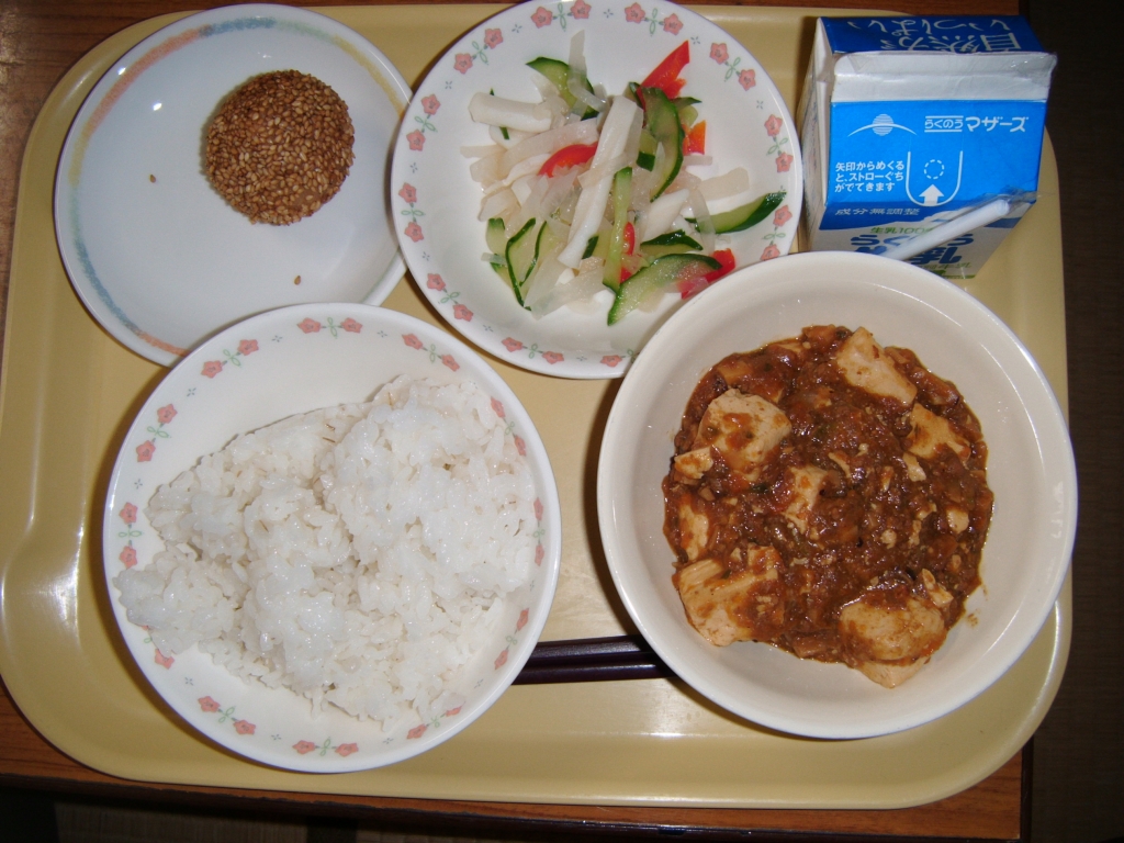 「牛乳、麦ごはん、マーボー豆腐、中華マリネ、ごま団子」でした