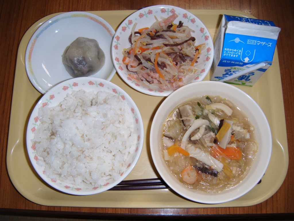 「牛乳、麦ごはん、焼き豚ときくらげのあえ物、エビ入りタイピーエン、いきなり団子」