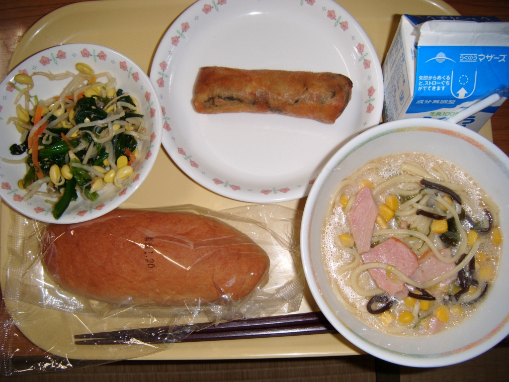 「牛乳、玄米パン、カルシウムたっぷり春巻き、もやしナムル、コーンラーメン」