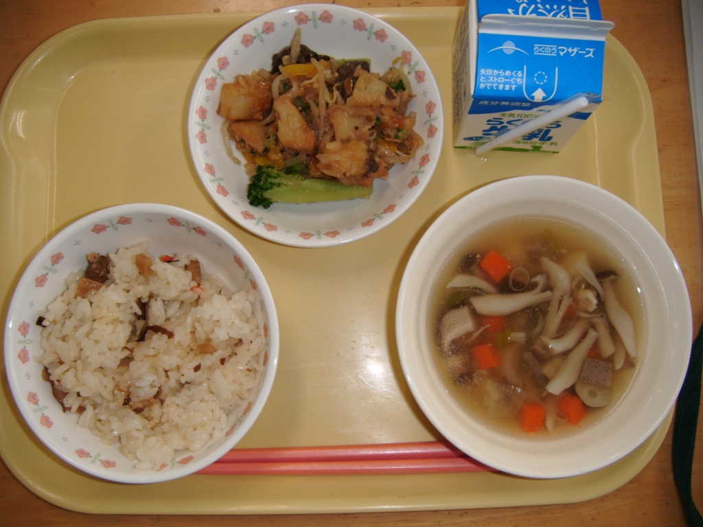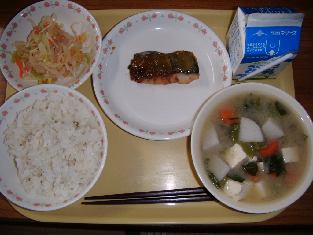 「牛乳、麦ごはん、魚の西京焼き、するめあえ、いものこ汁」