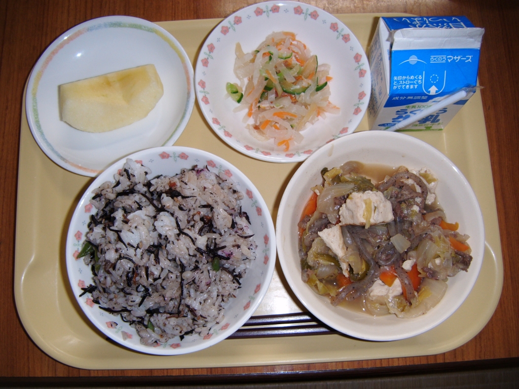「牛乳、ひじきごはん、だいこんのかりかり和え、肉豆腐、りんご」