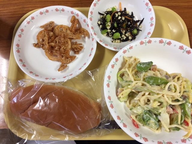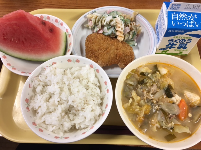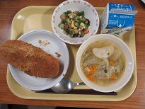 「麦ごはん、牛乳、すりみあげ、ひじきサラダ、わかめスープ」