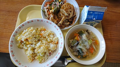 「レタスチャーハン、牛乳、春雨スープ、海藻サラダ、チップス」