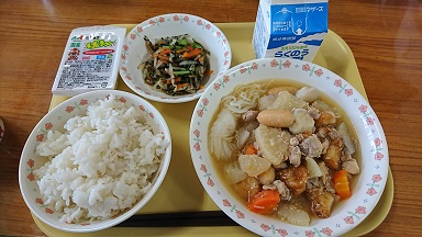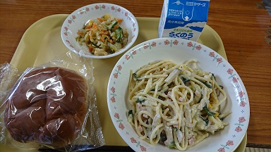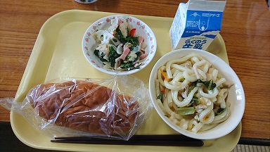 「ミルクパン、牛乳、五目うどん、かぶとレンコンのサラダ」