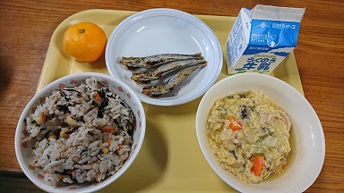 「大豆ひじきごはん、牛乳、南関あげのたまごとじ、丸ごと!いわし、みかん」