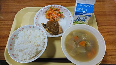 「ごはん、牛乳、けんちん汁、揚げサバのごまみそからめ、にんじんサラダ」