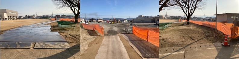 今週月曜日(25日)からは、10tトラックが出入りするようになり、手前の運動場側には保護のための鋼板が敷かれています。