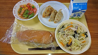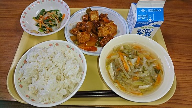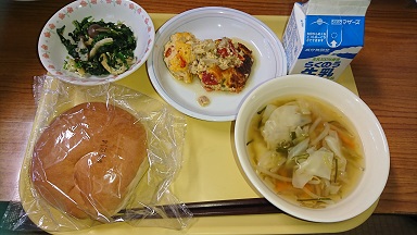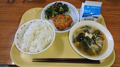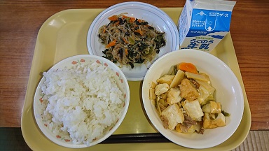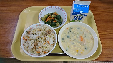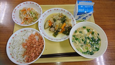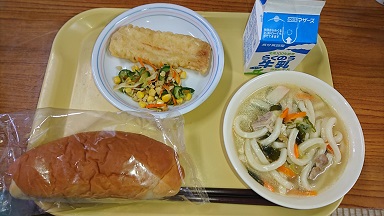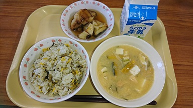 「麦ごはん、牛乳、すりみあげ、ひじきサラダ、わかめスープ」