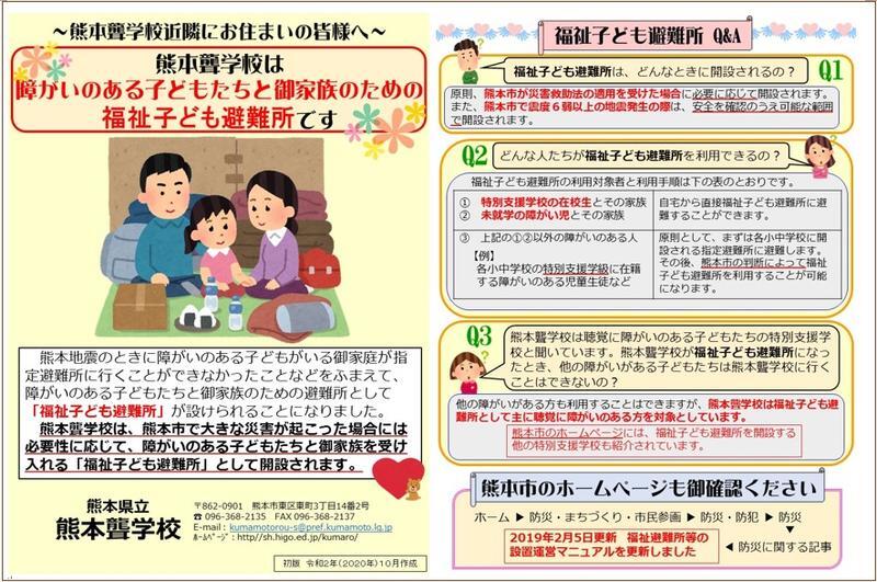 平成28年の熊本地震において、障がいのある児童等のいるご家庭が指定避難所に行くことができたかった等の事例を踏まえ、平成31年1月に熊本市と本校を含む熊本市内の県立特別支援学校4校及び熊大附属特別支援学校の間で「福祉子ども避難所」設置に関する協定を締結しました。