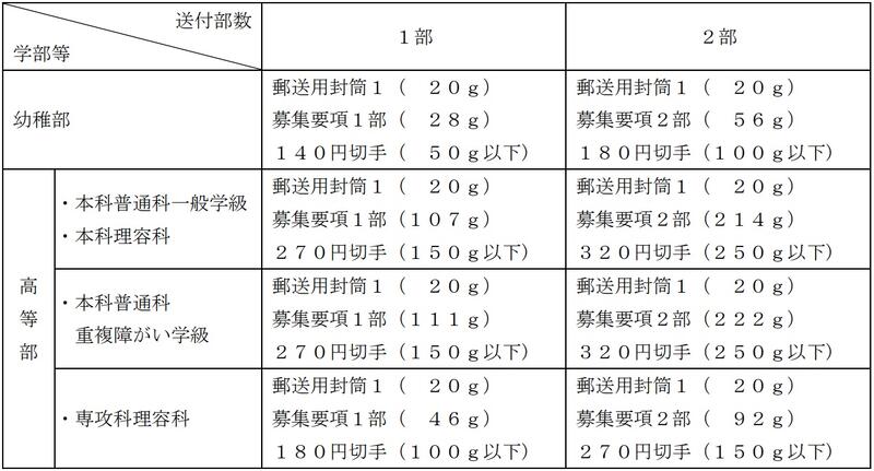 角形2号封筒に必要な料金分の切手(下表参照)を貼り、自分住所、郵便番号、氏名を書き、適当な大きさに折り曲げます。それを「募集要項希望」と朱書きした封筒(サイズは問いません。)に入れて熊本聾学校に送ってください。