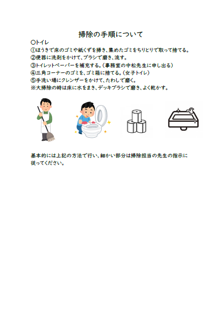 すべての生徒が視覚的に理解できるよう、「掃除の手順について」「棚の整理について」という掲示物を作成しました。文字だけではなく、イラストや実物写真を用いてイメージしやすい内容になっています。教室やトイレなどに掲示しているため、生徒たちはいつでも確認できます。