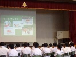夏季休暇中、倉岳校を見学しに来てくれた中学生へ学校行事の紹介をしたり、模擬授業の各教室まで案内・サポートを行ったりしました。少しでも興味を持ってもらえるように、マリンTシャツを着て案内をしたり中学生からの質問に答えたりすることができました。
