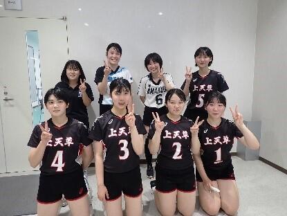 バレーボールという競技を通して、心技体の成長を目標に活動しました。仲間のことを考えてプレーし、多くの方々に支えられてバレーができることに感謝し、日々の活動に取り組みました。部員が少ないなかでしたが、上天草高校と合同チームを組み、高校総体に出場することができました。
