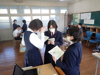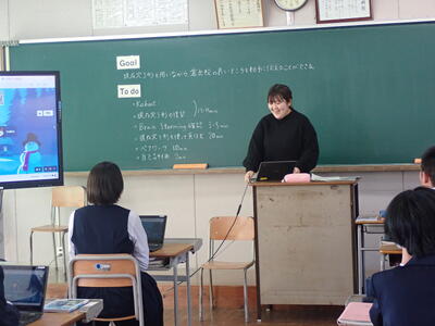 12月18日(木)、「英語コミュニケーションⅠ」で研究授業が行われました。導入や展開の場面において、ICTが多く活用され、生徒たちもICTを駆使しながら、積極的に、また、楽しく授業に参加することができていました。授業の内容は、「倉岳校の良さを海外の人に紹介する」というもので、自分で考え書いた英文を、ペアになって発表し合いました。相手の発表をしっかり聞くことができていました!