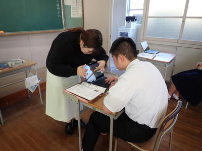 要点を説明された後に、問題の演習時間があり、解けた生徒は先生にノートを見せ、丸付けをしてもらっていました。個別指導ができるのは少人数学校の良いところですね!