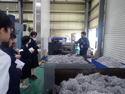 次に、実際に加工品を作る機械の説明を聞きながら見学しました。様々な形のアルミニウムを高い精度で様々な形に成形していく様子に、時折感嘆の声をあげつつ、大事な所はメモをとりながら、生徒は見学をしていました。途中、環境経営の一一例として、アルミニウムの切削加工時に発生する切粉(金属くず)を円柱状に圧縮してリサイクルに出している場面も見学できました。企業におけるSDGsの取組を具体的に知った貴重な場面でした。