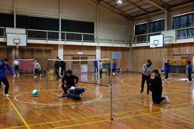 研修1では、3校の生徒・職員を8班に分け、ボッチャの試合を通して親睦を深めました。最初は、緊張した面持ちでしたが、試合が進むにつれ、笑顔や歓声が上がるようになり、表情も和らいでいました。