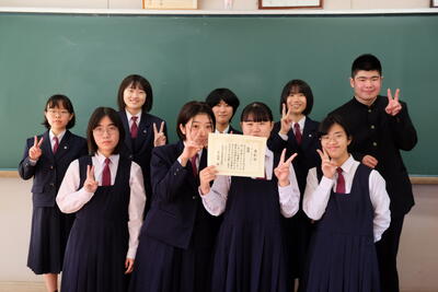まず、先日14日(日)に実施した長距離走大会(えびすマラソン10kmの部)の男子・女子各1位、第38回熊本県高等学校総合文化祭標語募集入賞者、日本漢字能力検定合格者の表彰がありました。
