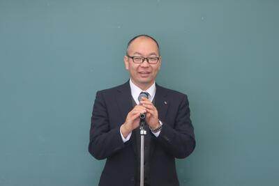 次に、終業式では、教頭先生よりお話がありました。2学期の取組を振り返りながら、各学年の生徒の成長したところ、継続して欲しいところ、頑張って欲しいところを話されました。その後、大河ドラマ『べらぼう』を例に挙げて、現在の「コスパ」・「タイパ」に見られるような必要最小限だけを求める価値観を重視して、書籍や絵画などの自分自身の関心の外側にある文化を無駄と決めつける生き方について再考を促すようなお話をしていただきました。自分には不必要だと思うものが、実は自分自身の人生を豊かにする可能性があること、授業や学校行事等、様々なことを経験する機会がある倉校生には、もっとできることや成長の可能性があることを伝えていただいたと感じました。