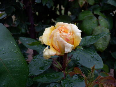 次は雨上がりのバラです。花びらに虫の来訪もあっています!