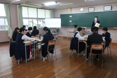 まずは、各教室に分かれて、ライブ配信で学校紹介が行われました。生徒会の司会進行で、校長先生からのご挨拶を初め、学校概要説明、部活動紹介、学校行事の紹介がありました。