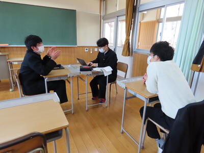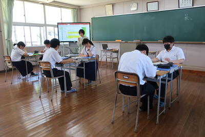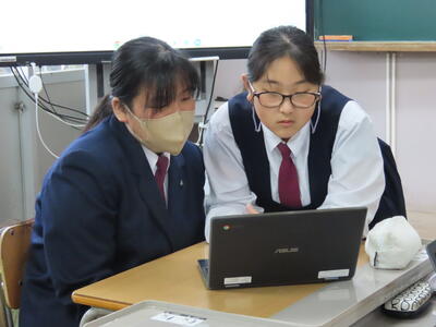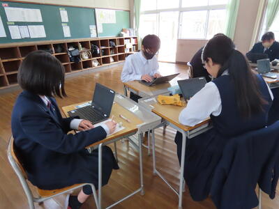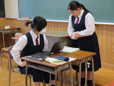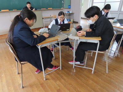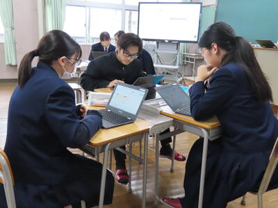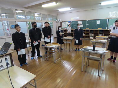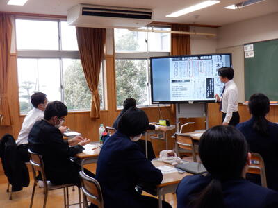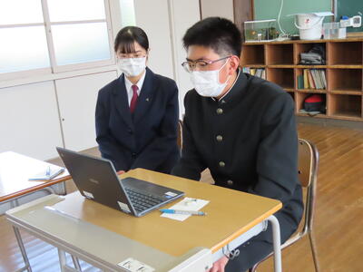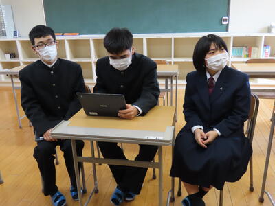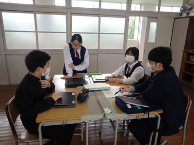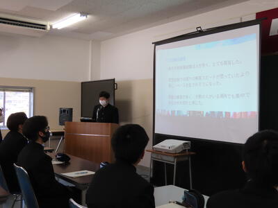3月11日(月)の2年生の総合的な探究の時間の様子です。今日は、3月18日(月)に行われる分校同盟【熊本県立高校OneTeamプロジェクト事業】の探究活動発表に向けて練習を行いました。