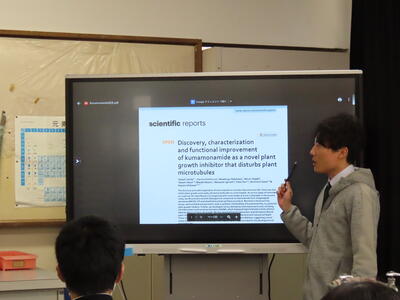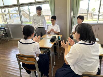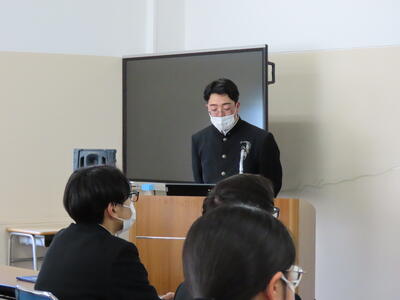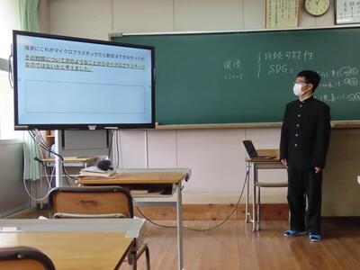 3月12日(火)の昼休みの1年生の様子です。マイクロプラスチック班の生徒が昼休みの時間を利用して分校同盟【熊本県立高校OneTeamプロジェクト事業】の探究活動発表の練習を行いました。
