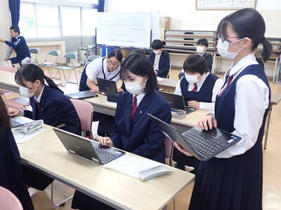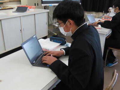 1年生の科学と人間生活の授業の様子です。現在、1年生の科学と人間生活では物理・化学・生物・地学の観点からえびすビーチを探究し、それぞれの分野の課題についてレポートを作成しています。