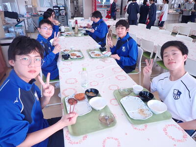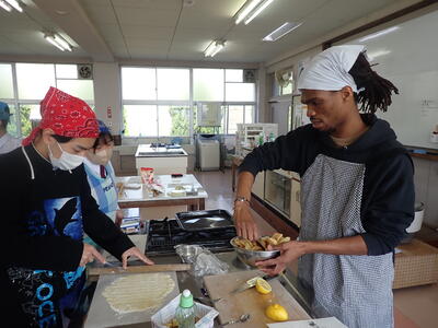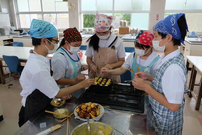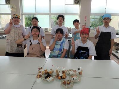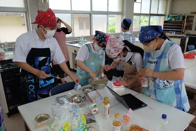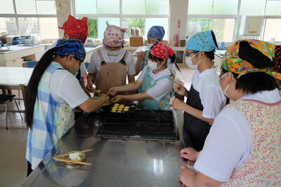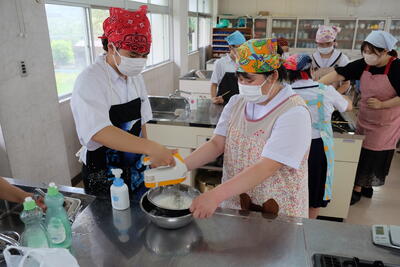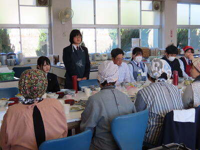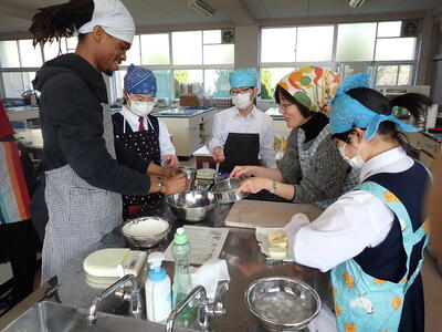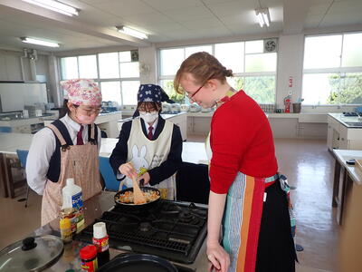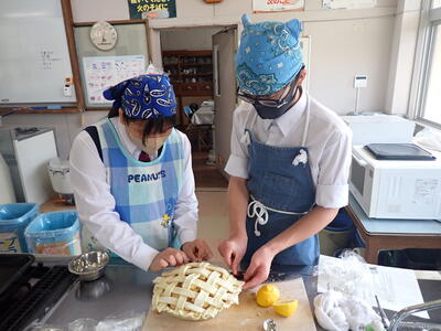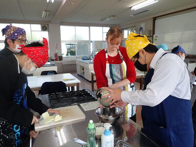 3月15日(金)、1年生と2年生がALTの先生と英語でコミュニケーションをとりながら調理実習を行いました。実習では前日の3月14日、円周率の日にちなんでミートパイとアップルパイを作りました。
