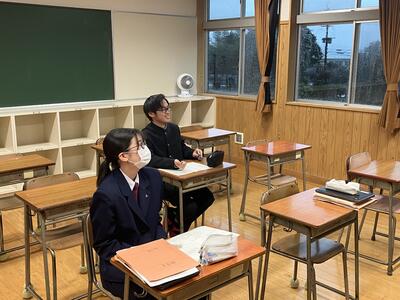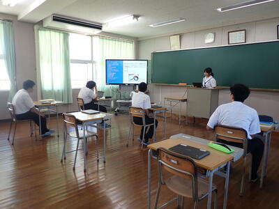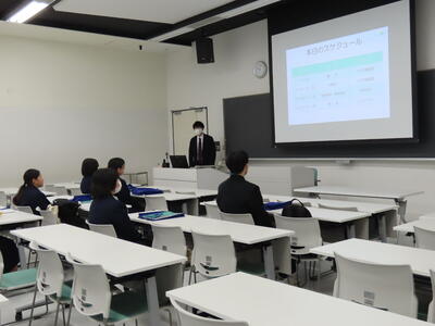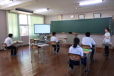 まずは、体験授業が行われる教室に分かれて、ライブ配信で学校紹介が行われました。生徒会の司会進行で、校長先生からのご挨拶を初め、学校説明、部活動紹介、学校行事の紹介がありました。
