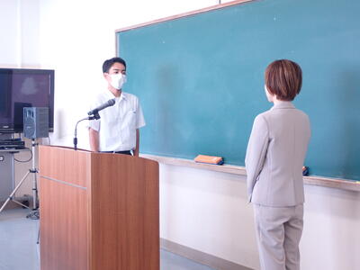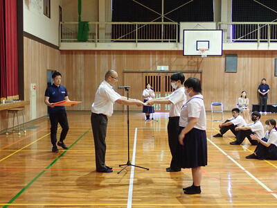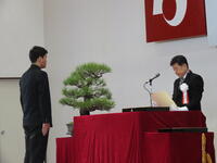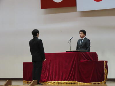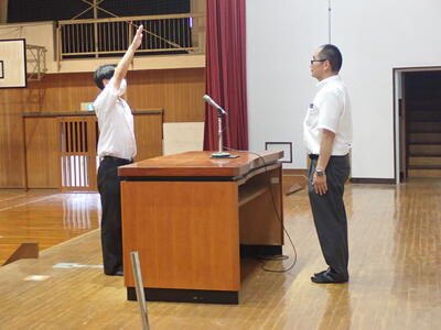 終業式の前に、生徒会役員認証式が行われました。先日の生徒会役員選挙によって選出された生徒会長、副会長が校長先生より認証を受け、新生徒会が発足しました。新しい生徒会役員、各委員会の委員長が紹介された後、新生徒会長の挨拶がありました。先輩たちが築いてきた伝統を引き継ぎつつ、新しいことにチャレンジしようとする意気込みが感じられました。これまで、倉校を支えてきてくれた3年生のみなさん、本当にお疲れ様でした!