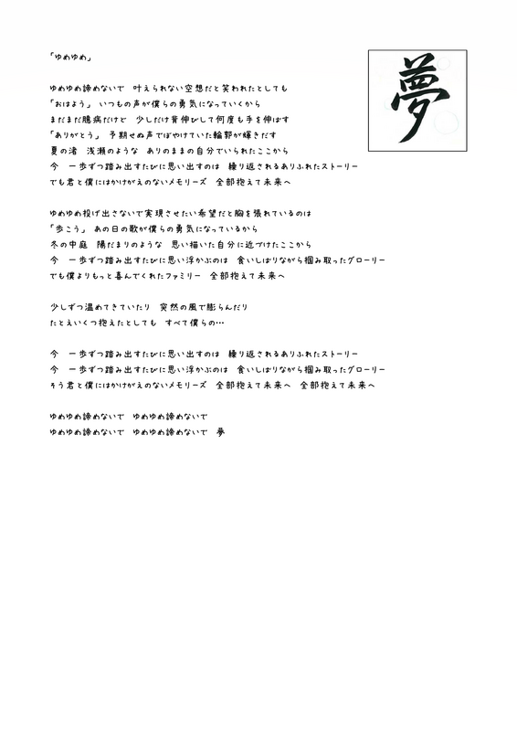 「ゆめゆめ」は本校の職員が卒業生に向けて作詞・作曲した曲名です。この曲は3月2日(土)の卒業式の退場曲にもなっています。視聴はこちらをクリックして下さい。 ↓
