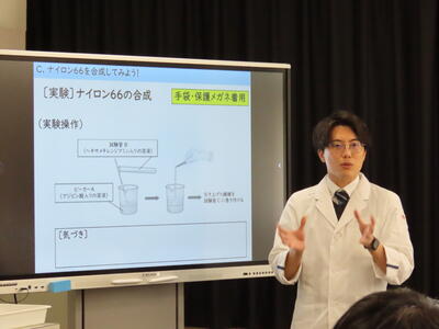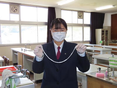 3月14日(木)の科学と人間生活の様子です。今日の授業ではヘキサメチレンジアミンとアジピン酸からナイロン66を合成し、できたナイロン66でひもを作りました。