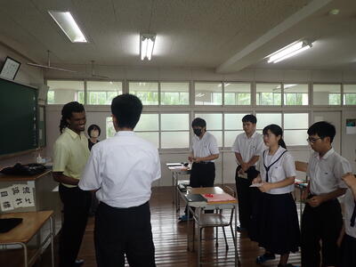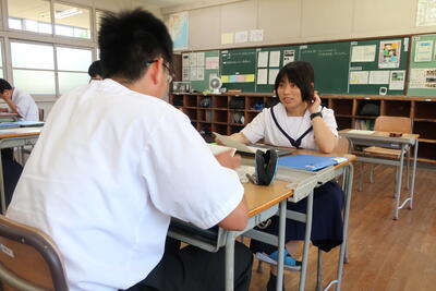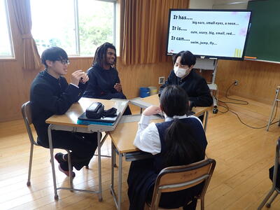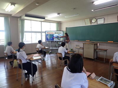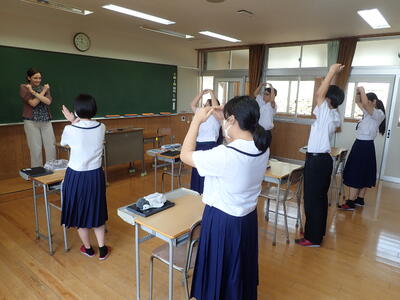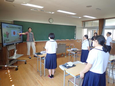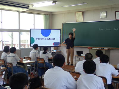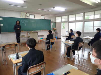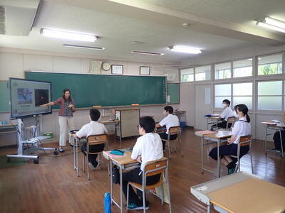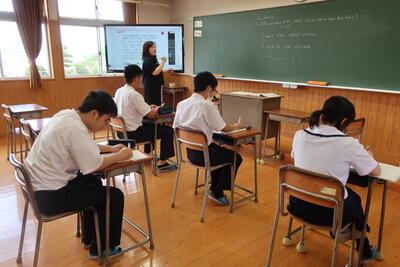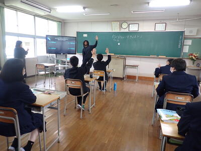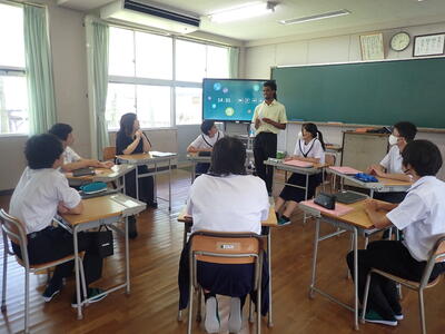 第1回目となる今日の授業は、新しいALTの先生の自己紹介でした。途中、True(〇)/Fales(✕)形式のクイズも出題されました。最初、緊張した様子だった生徒たちでしたが、クイズに回答したり質問をしたりする中で、徐々に緊張もほぐれ、新しいALTの先生との親睦を深めていました。