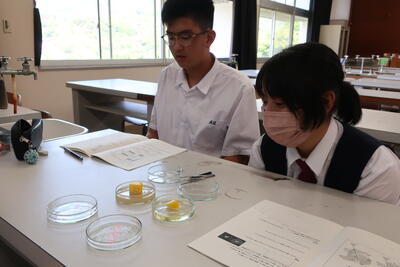 4月16日(火)、1年生は「総合的な探究の時間」に自分史を作成し、「自分を知る」活動を行いました。2年生の「生物基礎」では、オオカナダモの細胞の大きさをミクロメーターを使って測定しました。3年生は来週の歓迎遠足に向けて、学年の出し物について話し合いを行いました。