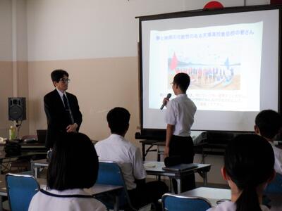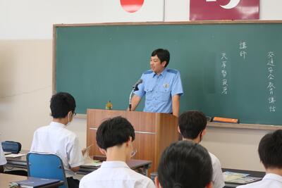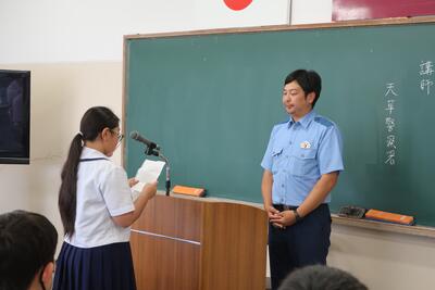 本日、6限目に交通安全教育講話を実施しました。天草警察署倉岳駐在所の方を講師としてお招きし、自転車の利用規則や自転車の交通違反・事故事例についてご教授頂きました。