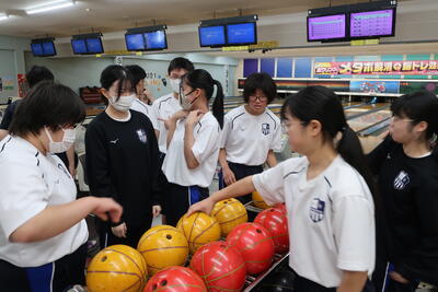まずは、ボール選びから始まります。みんな、慎重に選んでいます。1年生は初めてボーリングをする生徒もおり、ドキドキの初挑戦です!