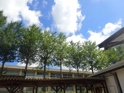 倉校には気持ちの良い空間が多くあります。こちらは中庭の銀杏(いちょう)並木で、今、緑の葉を茂らせていま