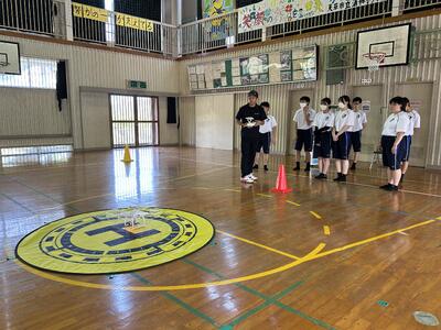 岳さんは旧浦和小学校を活用されており、教室や体育館で、生徒たちはトイドローンの操作やコーンの表示に従っての操作も体験させていただきました。