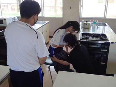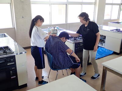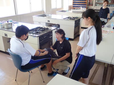実習後、「今回、自分が介助する側と介助される側を体験して、それぞれの立場で何をすれば良いのかが分かった。この経験を通して、もし今後目の前で誰かが倒れたら、今日教えてもらったことを実践して、助けたいと思います。」や「介護実習で、支えてあげることや声かけがとても大事で、びっくりさせてしまわないように明るい声を心がけたいと思いました。今後、おじいちゃんに正しい介護の仕方をして、生活を楽にさせてあげたいと思いました。」という感想があり、今回の実習が生徒にとって実り多いものだったと感じました。