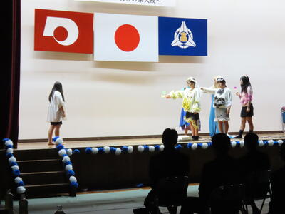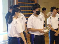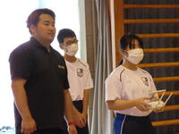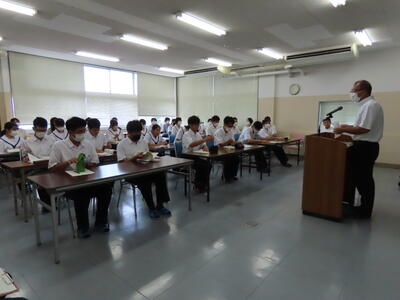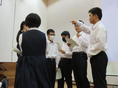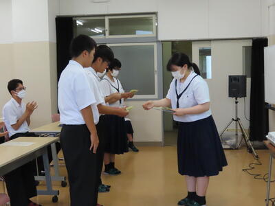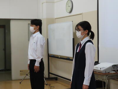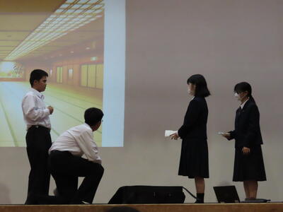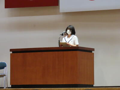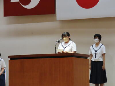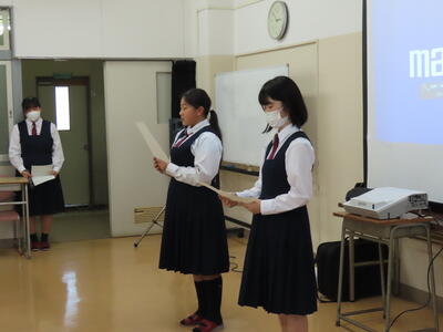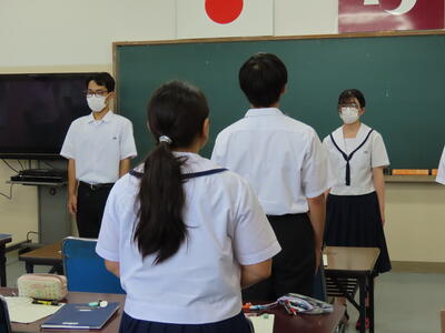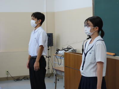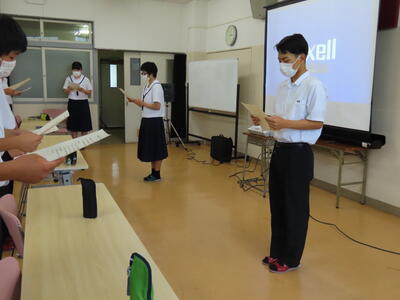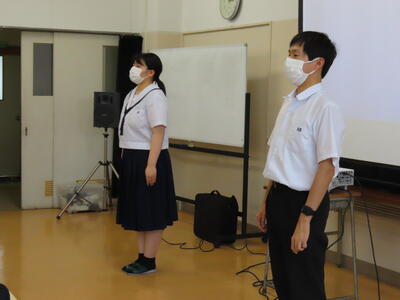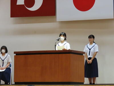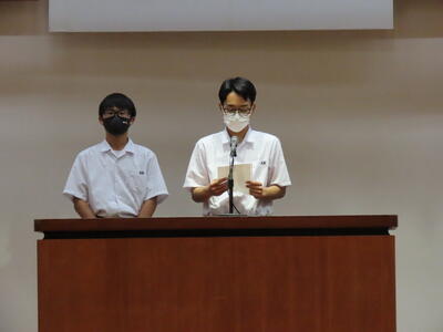 7月3日(月)、多目的研修室で全校集会が行われました。全校集会では歓迎遠足で行われたフォトコンテストの表彰やいじめを許さない宣言文唱和などが行われました。
