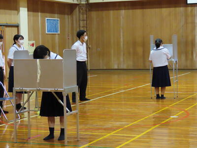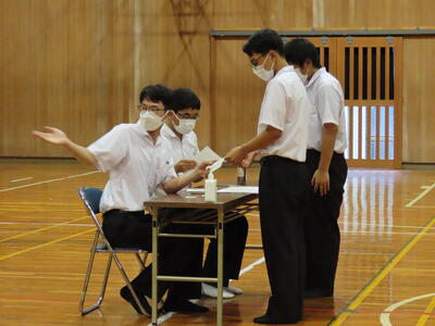 7月4日(火)、新生徒会役員を決める選挙に伴い立会演説会が行われました。選挙には4名立候補し、各立候補者、応援者が演説を行いました。立会演説の後は、選挙管理委員の指示のもとに投票が行われました。